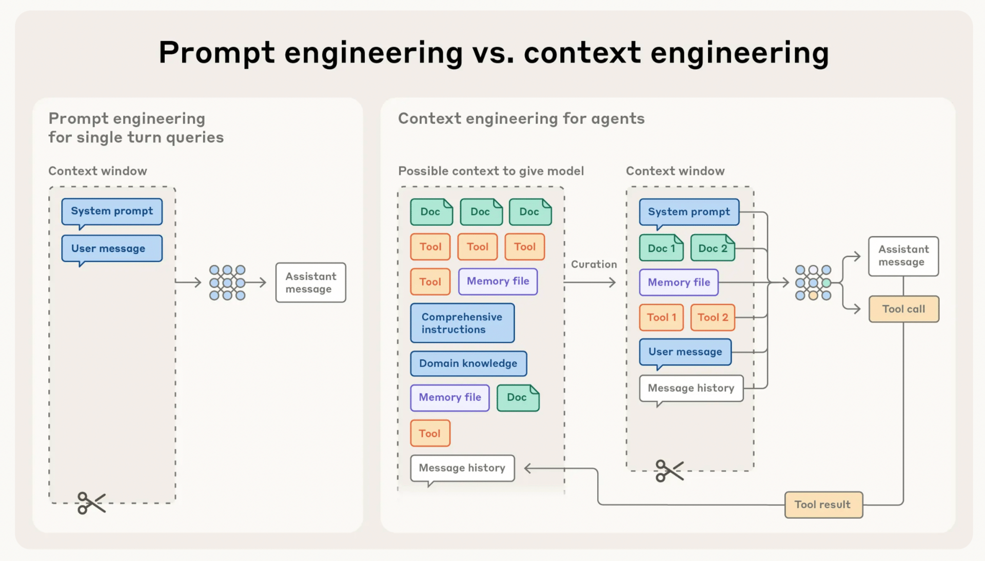 Context Engineering hingegen ist, als würdest du den gesamten Arbeitsplatz gestalten, damit er jederzeit optimal denken kann: Du entscheidest, welche Notizen auf dem Whiteboard stehen, welche alten Memos gelöscht werden, welche Dokumente auf dem Schreibtisch liegen und welche Tools er gerade nutzen darf.