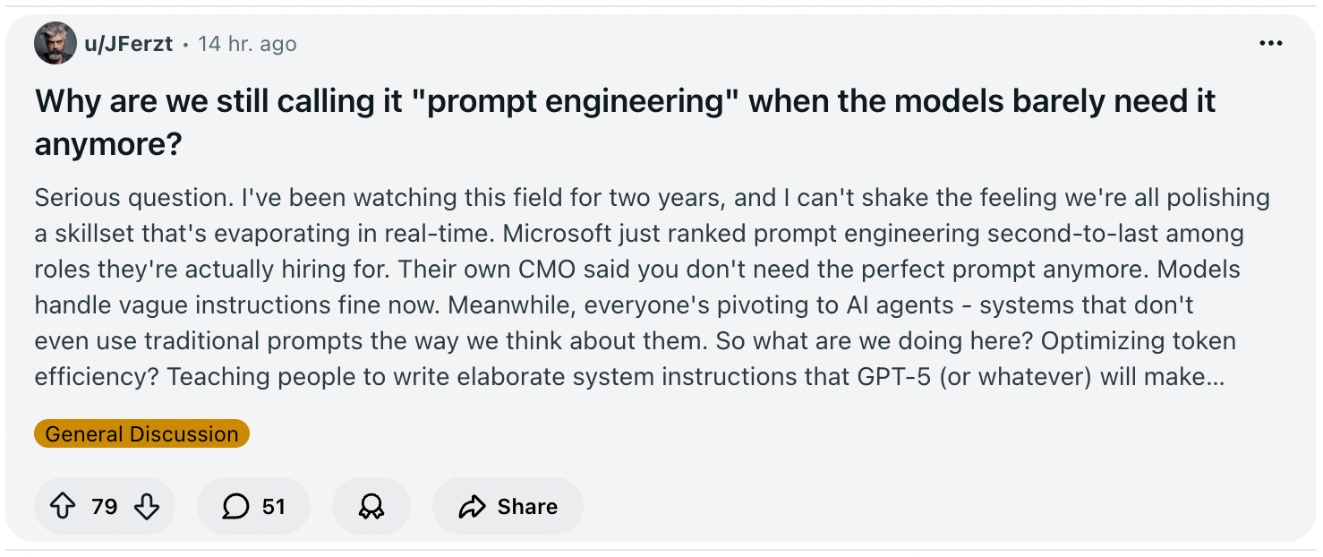 Auf Reddit wird es nämlich stark angezweifelt. In einem Post heißt es: "Warum nennen wir es eigentlich noch Prompt Engineering, wenn die Modelle es kaum noch brauchen?" Das Argument: Wir feilen an einer Fähigkeit, die in Echtzeit verschwindet.