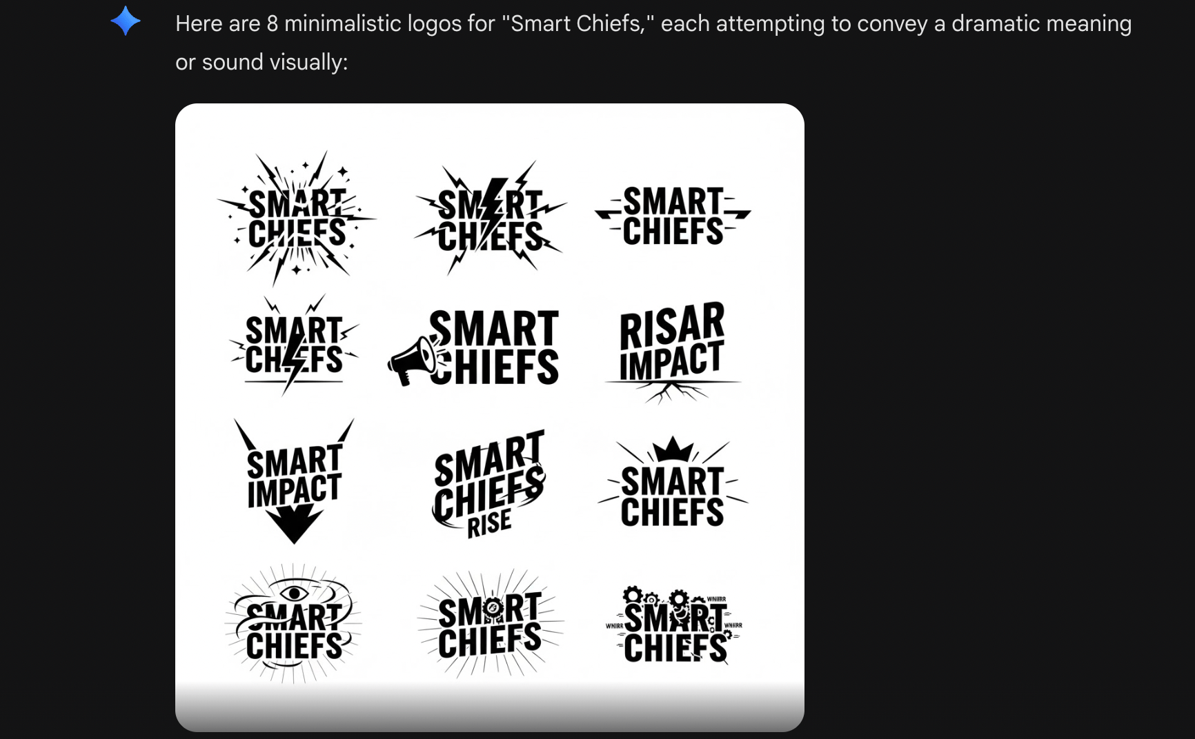 Prompt: Erstelle 8 minimalistische Logos aus dem Wort „Smart Chiefs“, und lass die Buchstaben visuell eine Botschaft oder einen Laut vermitteln, um eine andere Bedeutung dieses Wortes auf dramatische Weise auszudrücken. Komposition: Flache Vektor-Darstellung aller Logos in Schwarz auf einem einzigen weißen Hintergrund.