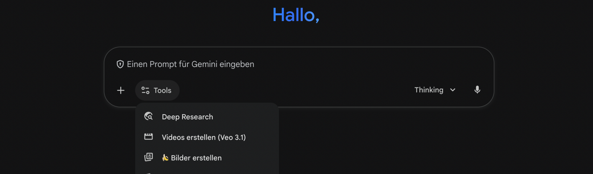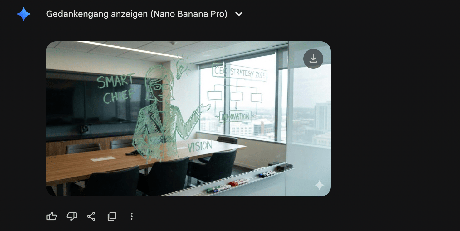 Voraussetzung: bei gemini.google.com auf "Bilder erstellen” gehen und rechts den “Thinking Modus” einstellen. Im Thinking‑Modus „denkt“ Nano Banana Pro zuerst über deinen Prompt nach, bevor es das Bild rendert. Dadurch werden komplexe Szenen logischer, konsistenter und oft auch näher an deiner eigentlichen Absicht. (Nur in der Bezahl-Version)
